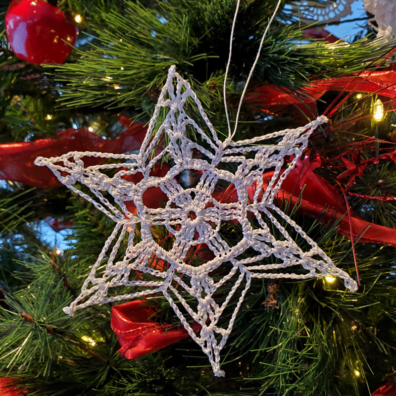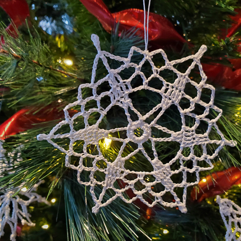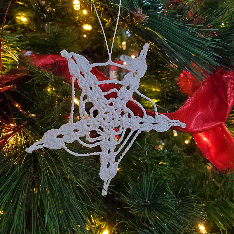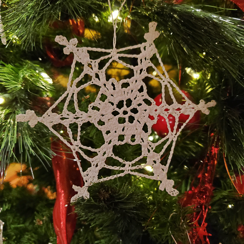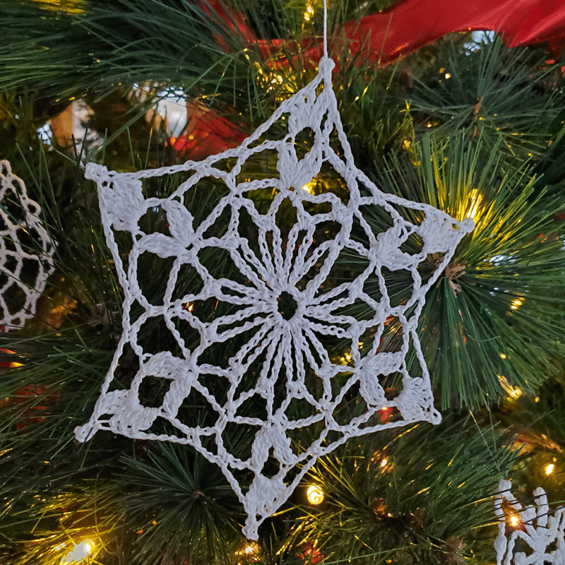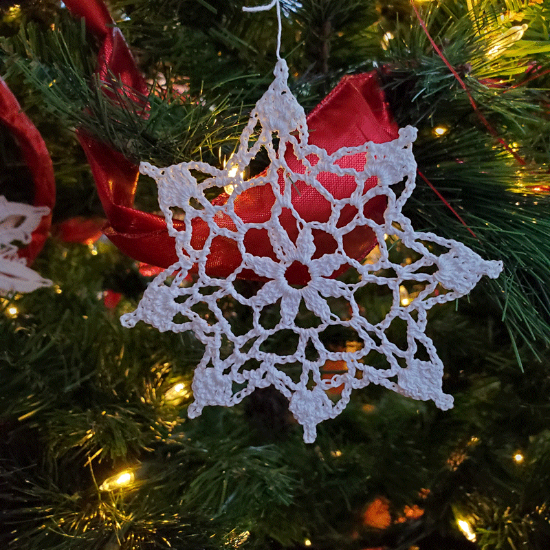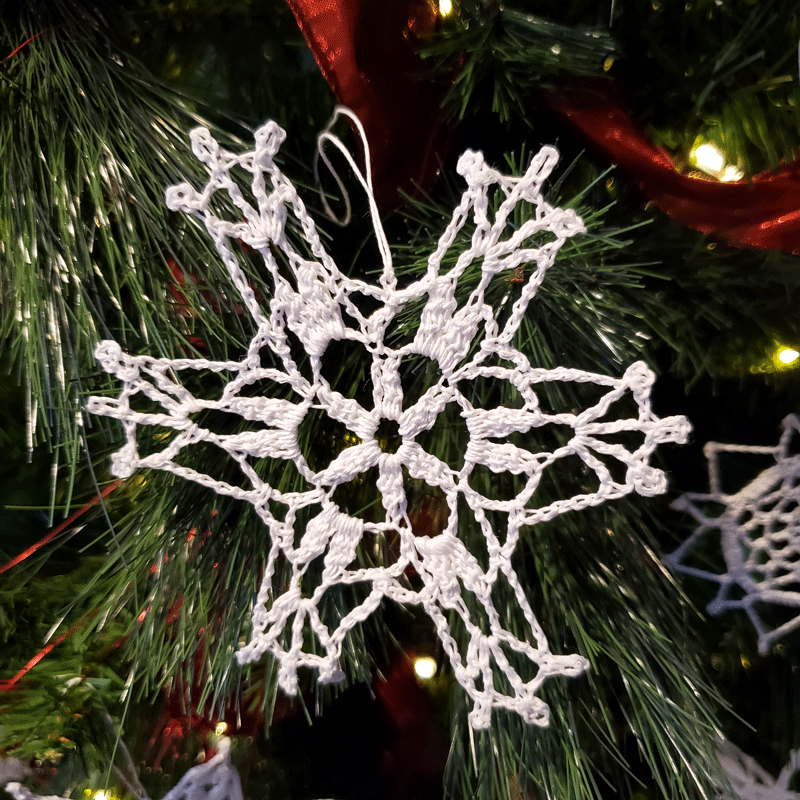 This year, I placed over 3-dozen different snowflakes on my Christmas tree. They range in size from the two, tiny 5-pointed stars (1.5 inches) to the largest 6-inch snowflakes. Most of them are traditional, 6-pointed creations. See if you can find the unusual snowflakes with 11 or 13 points.